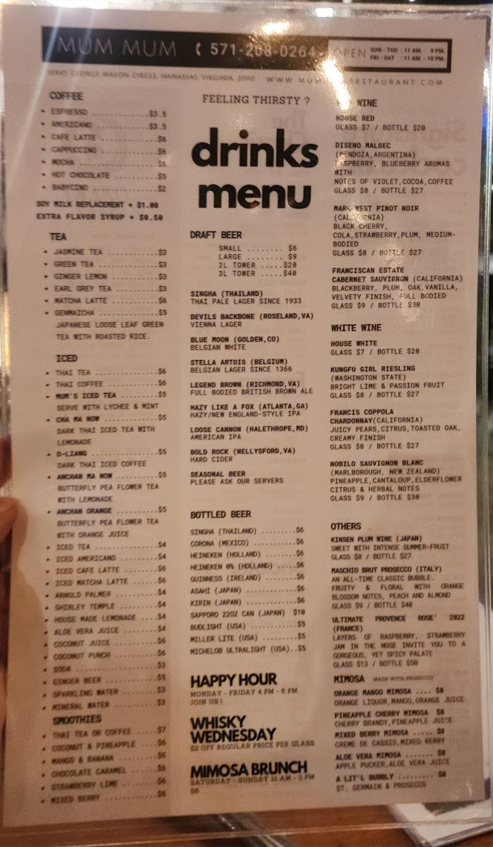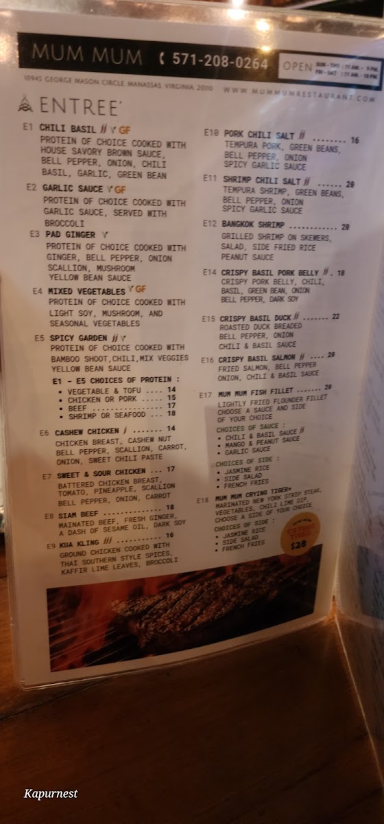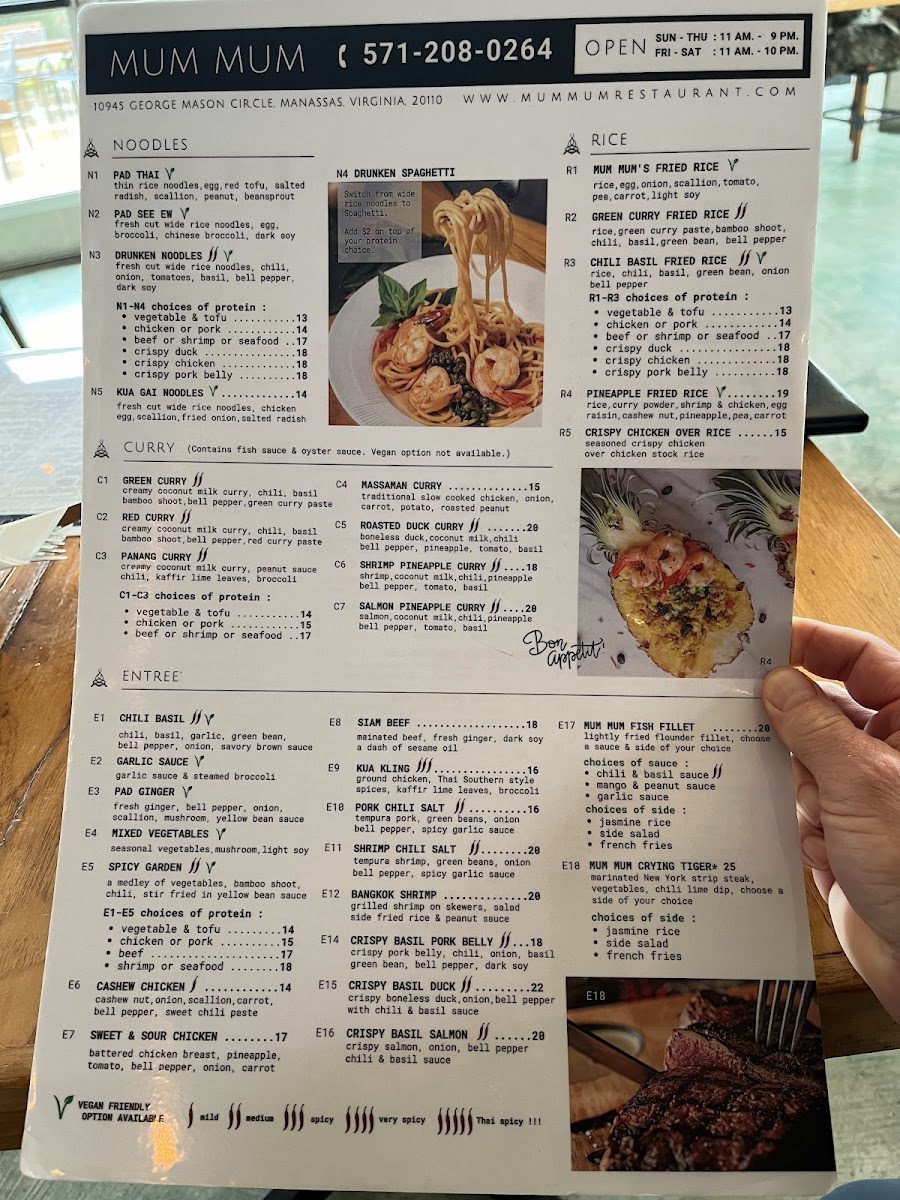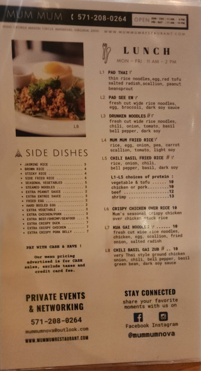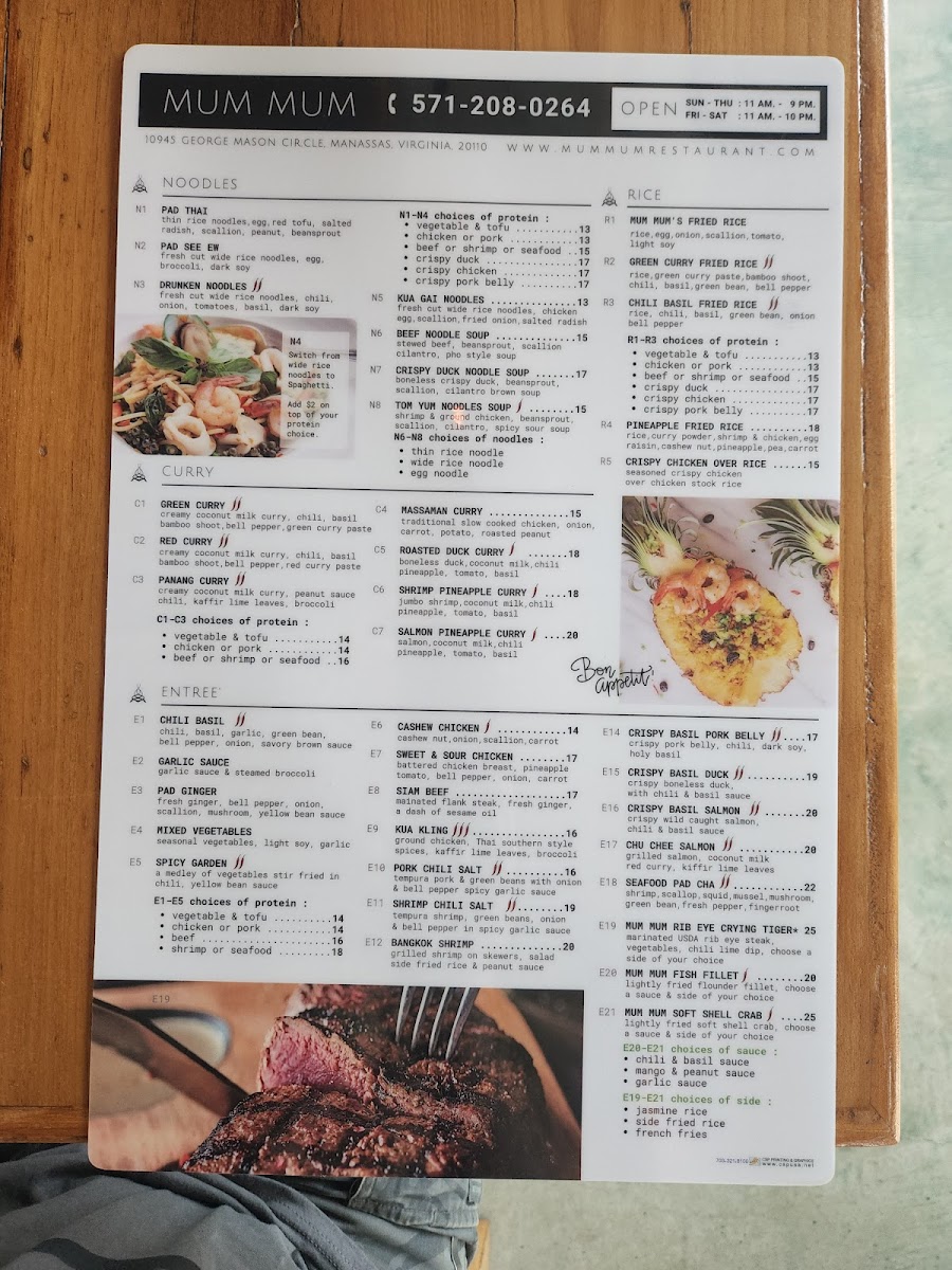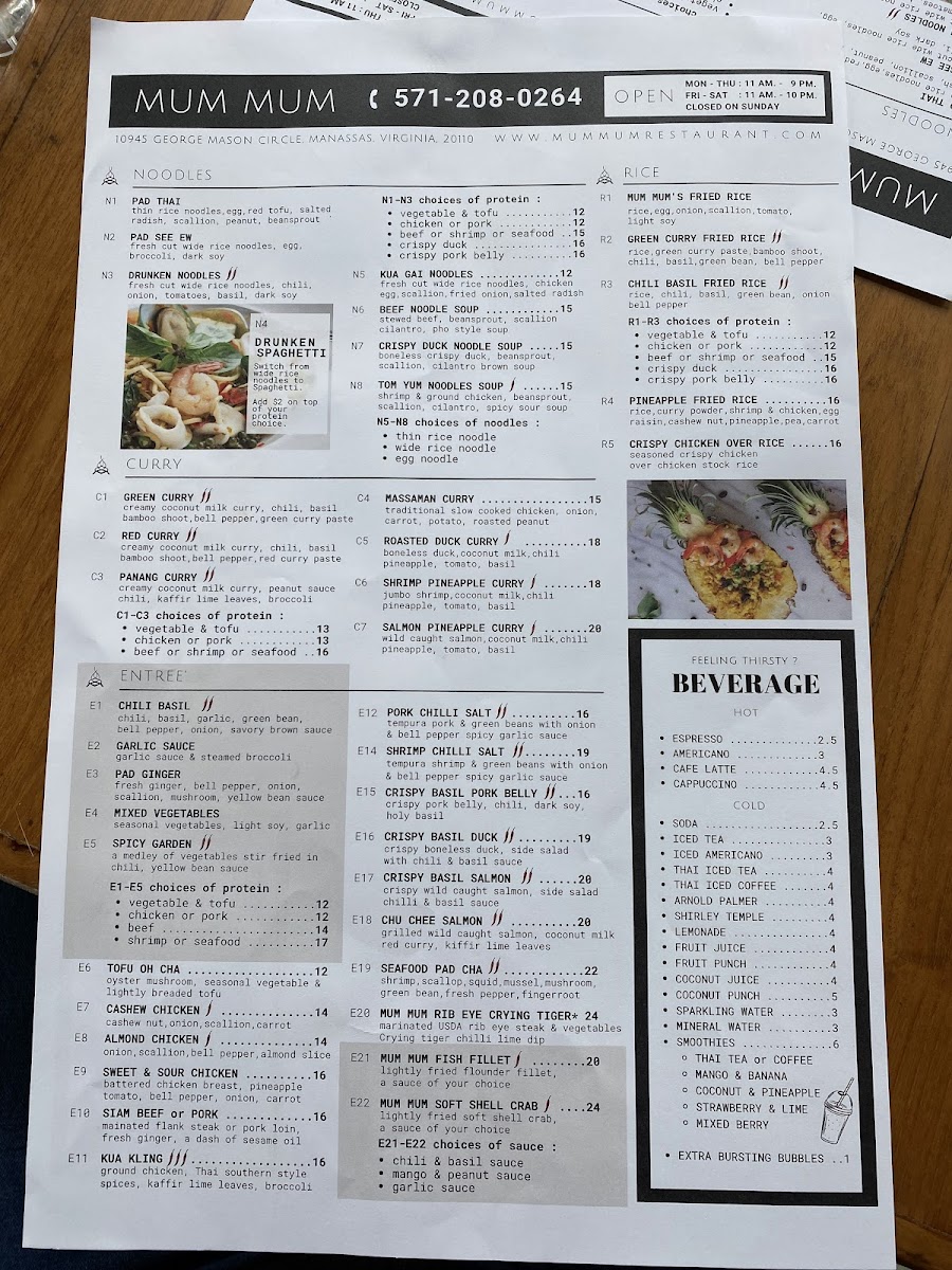 For reservations or inquiries, call Mum Mum Restaurant at +1 571-208-0264. Your taste of Thailand awaits!