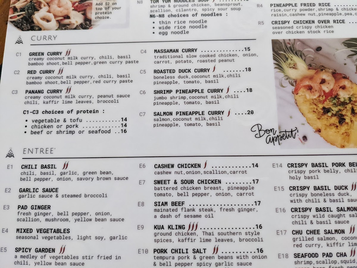 If fried rice catches your fancy, try the Pineapple Fried Rice, where sweet and savory elements unite with shrimp, chicken, and cashew nuts for a symphony of flavors that dance on your palate. The Chili Basil Fried Rice will appeal to those who appreciate a medium spice level, featuring fresh ingredients like chili, basil, and green bean.